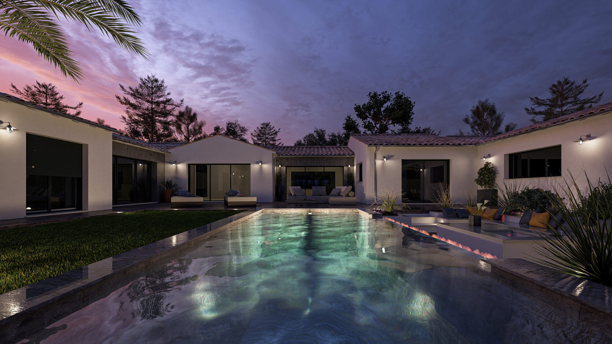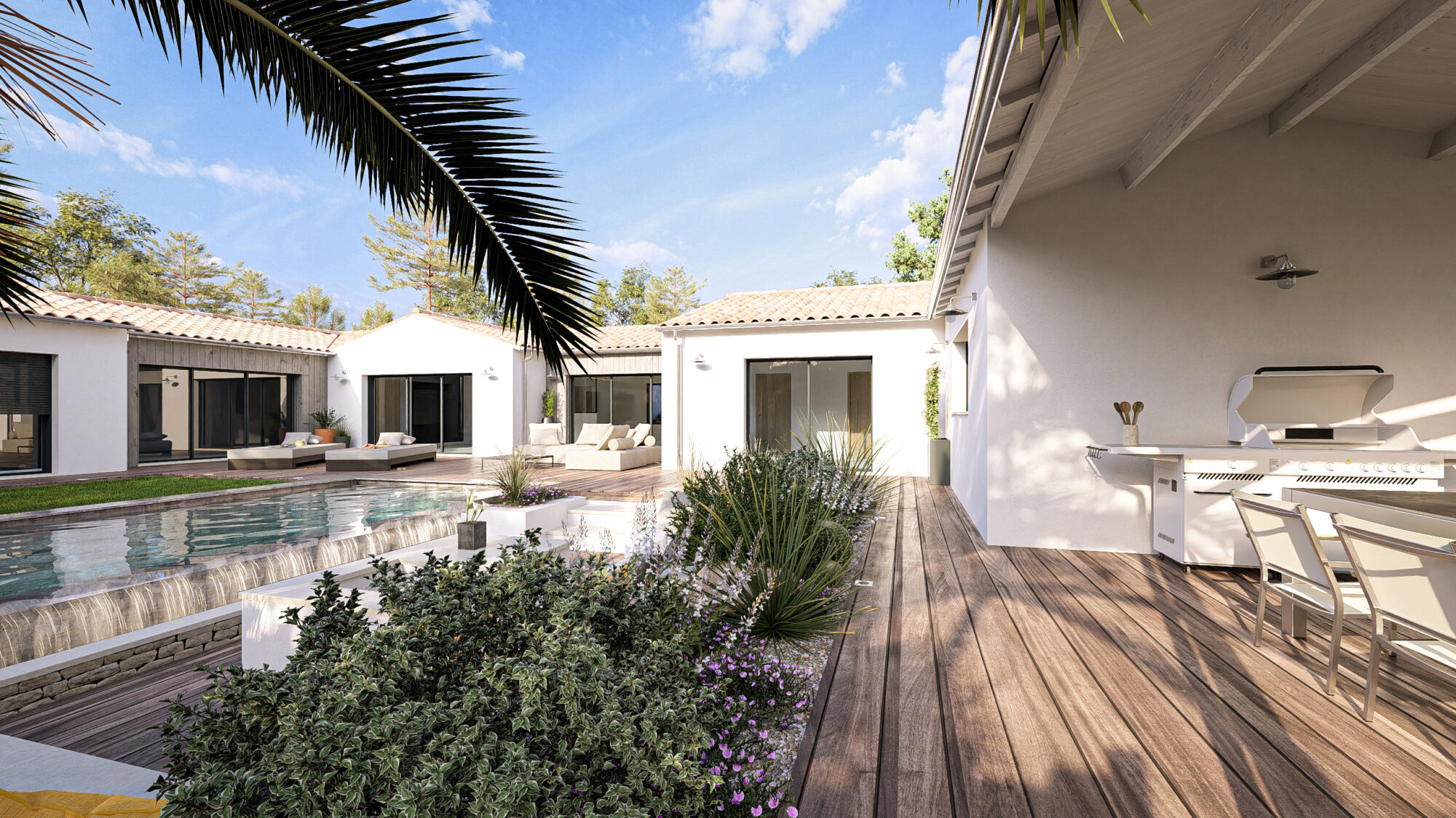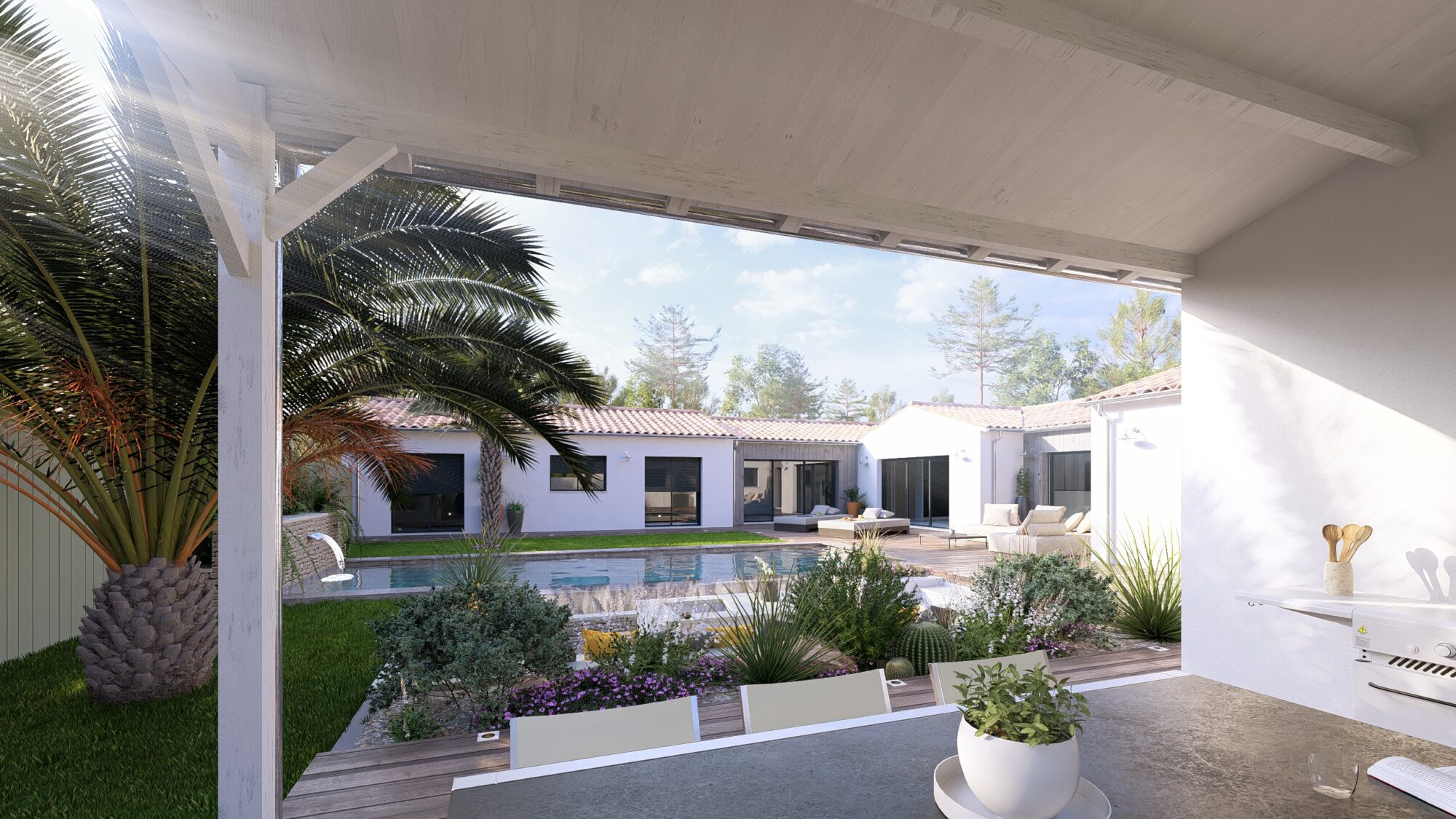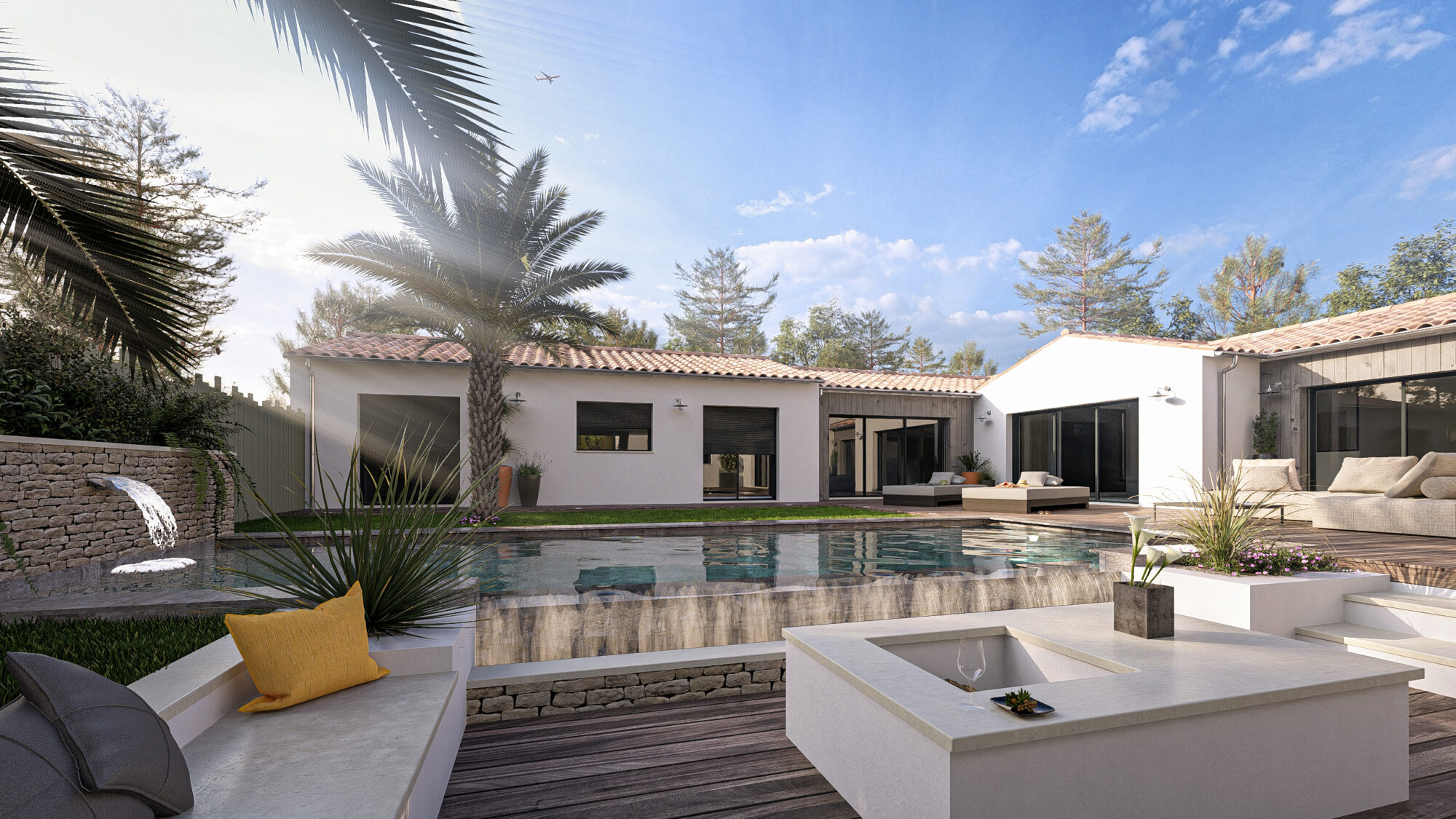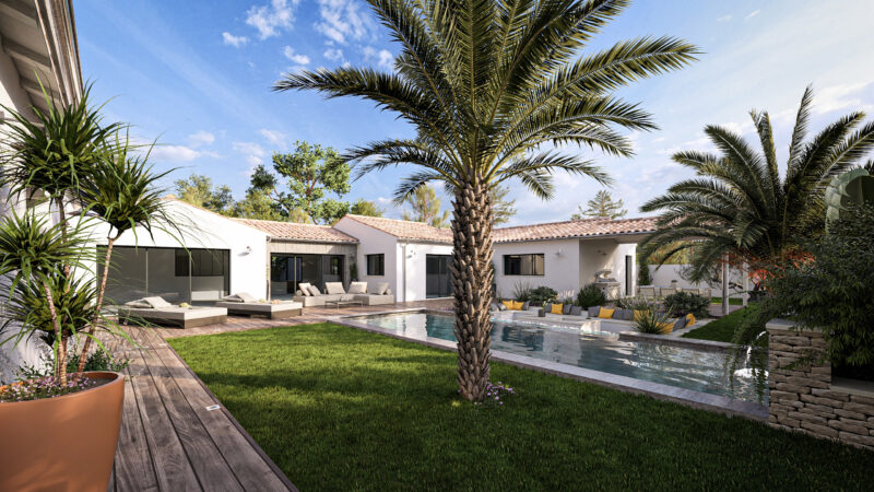 Découvrez cette superbe villa contemporaine de plain-pied, alliant élégance, luminosité et confort moderne. Nichée dans un environnement verdoyant et calme, elle séduit par son architecture épurée et son agencement en U, parfaitement orienté autour d’un espace extérieur central agrémenté d’une piscine à débordement.