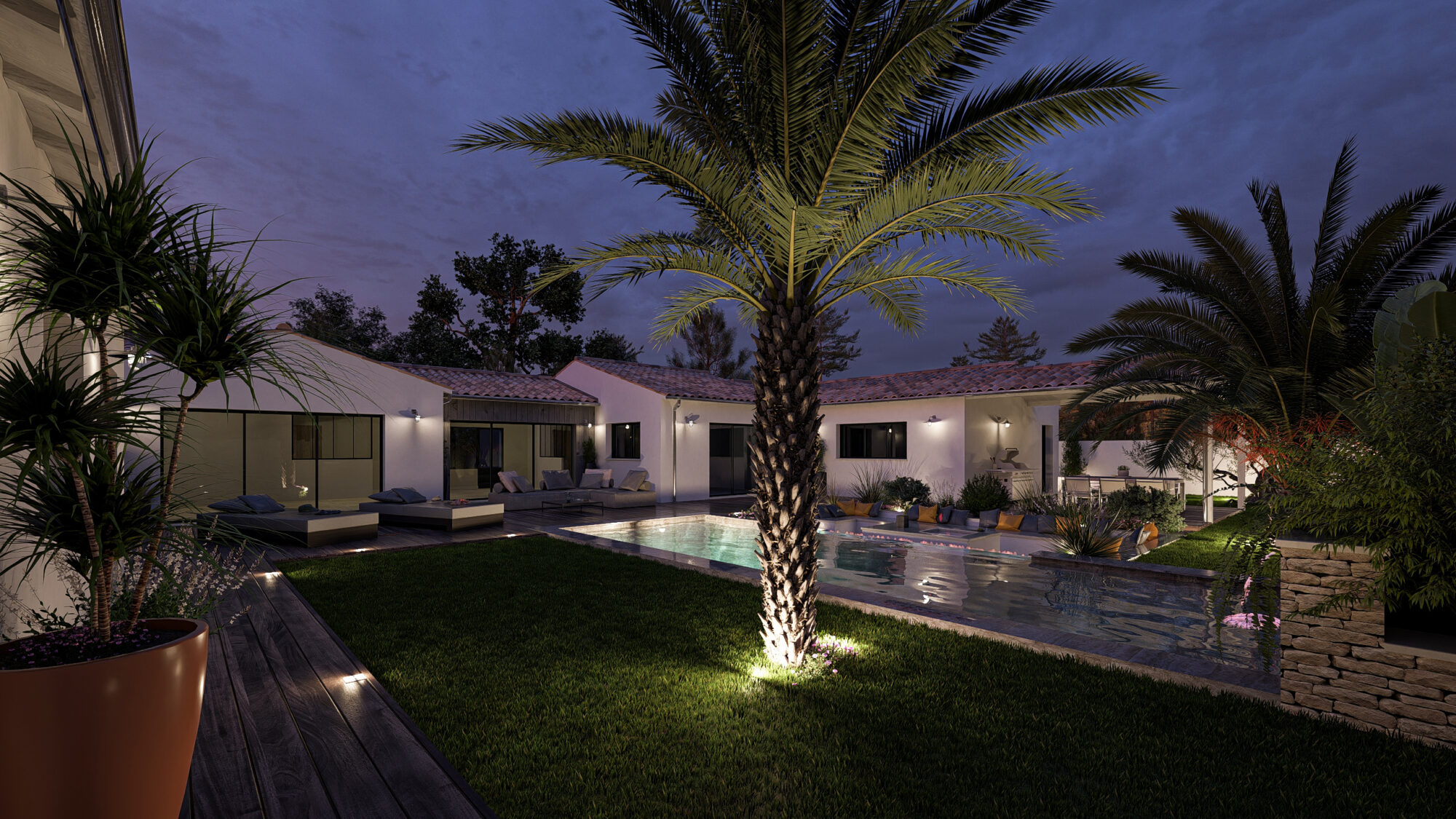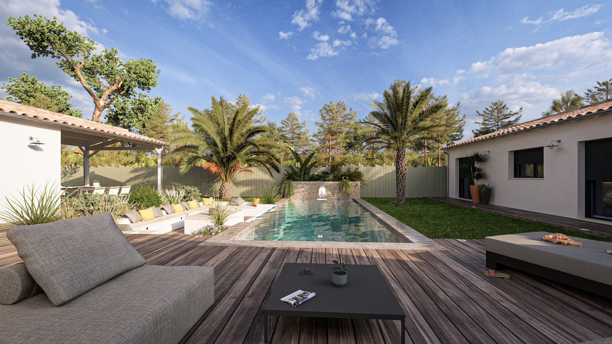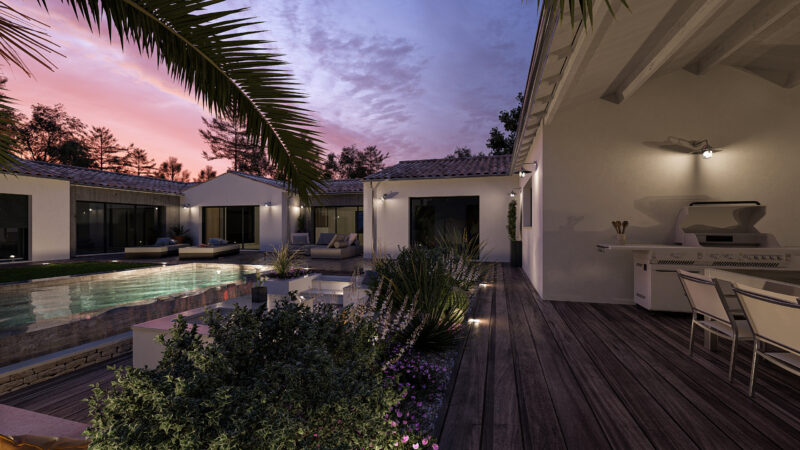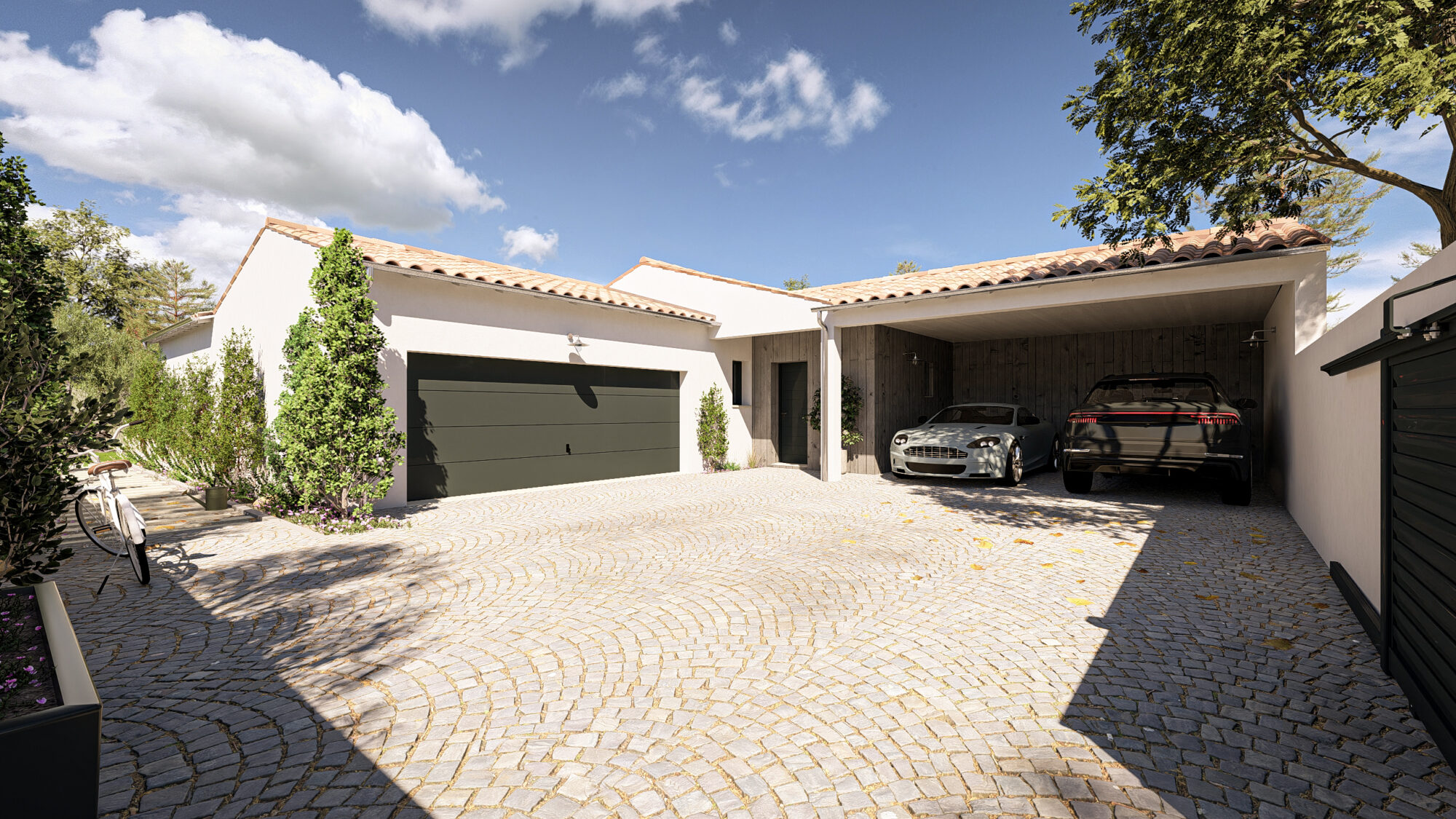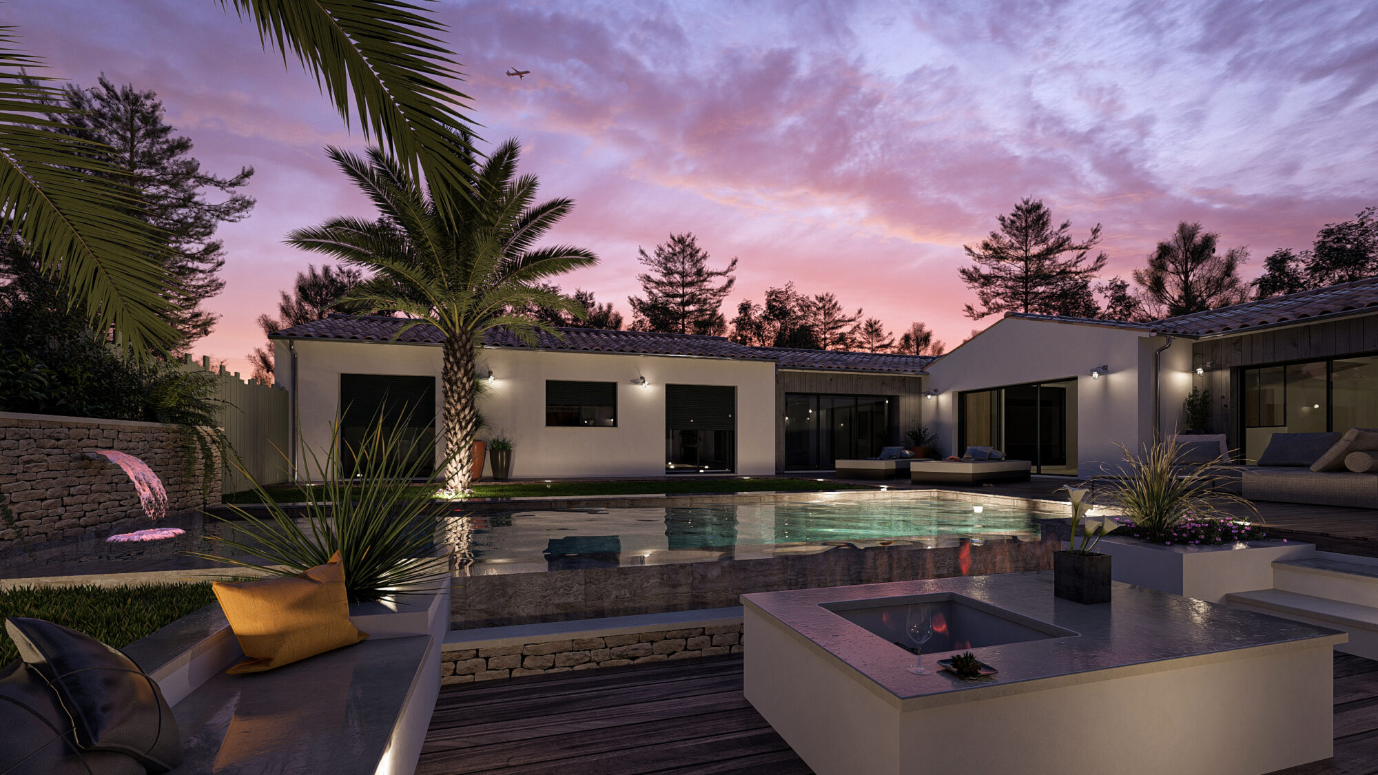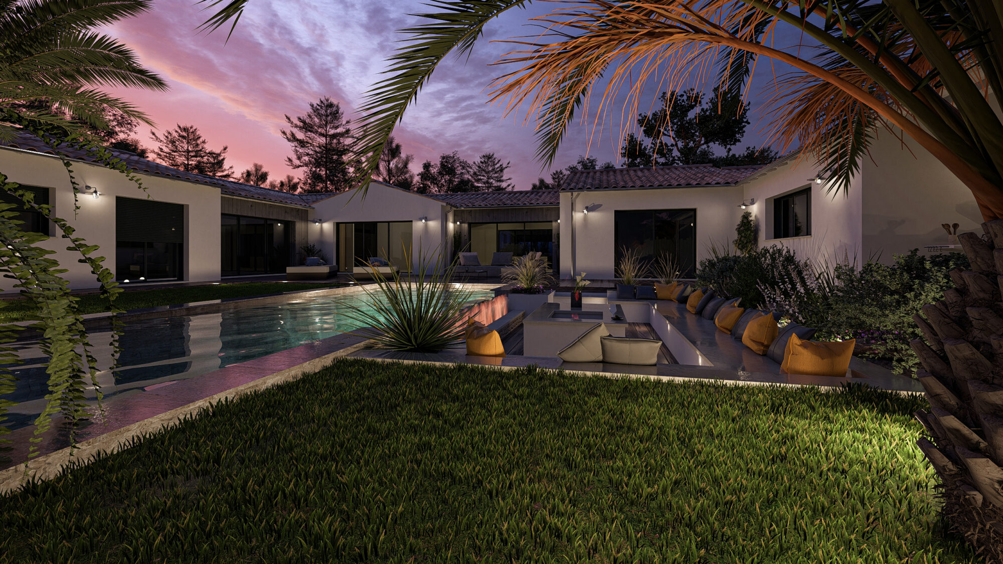 Découvrez cette superbe villa contemporaine de plain-pied, alliant élégance, luminosité et confort moderne. Nichée dans un environnement verdoyant et calme, elle séduit par son architecture épurée et son agencement en U, parfaitement orienté autour d’un espace extérieur central agrémenté d’une piscine à débordement.