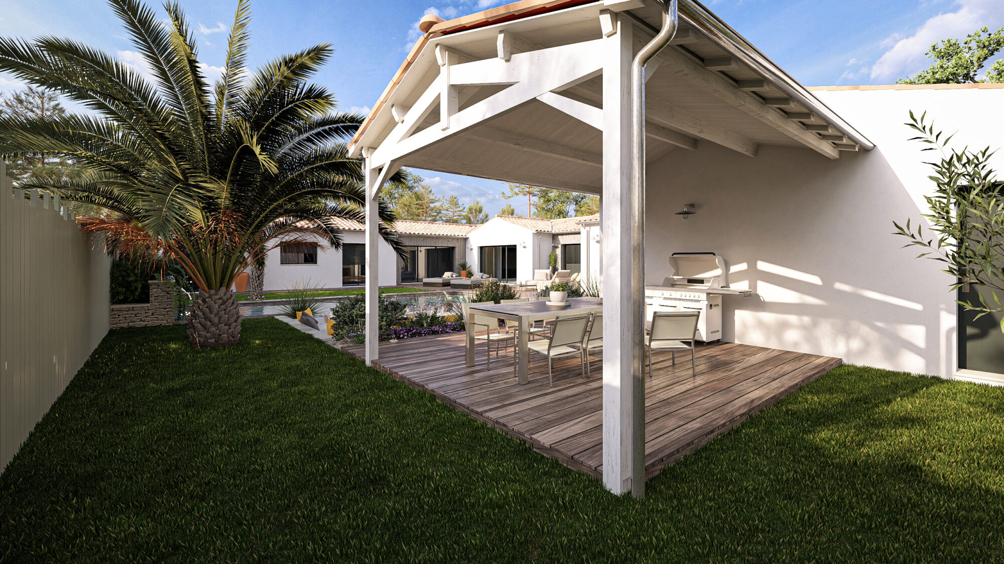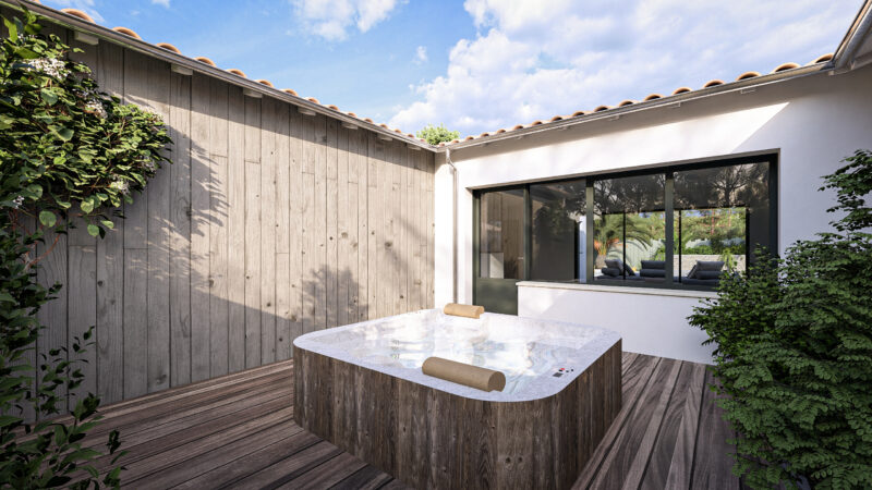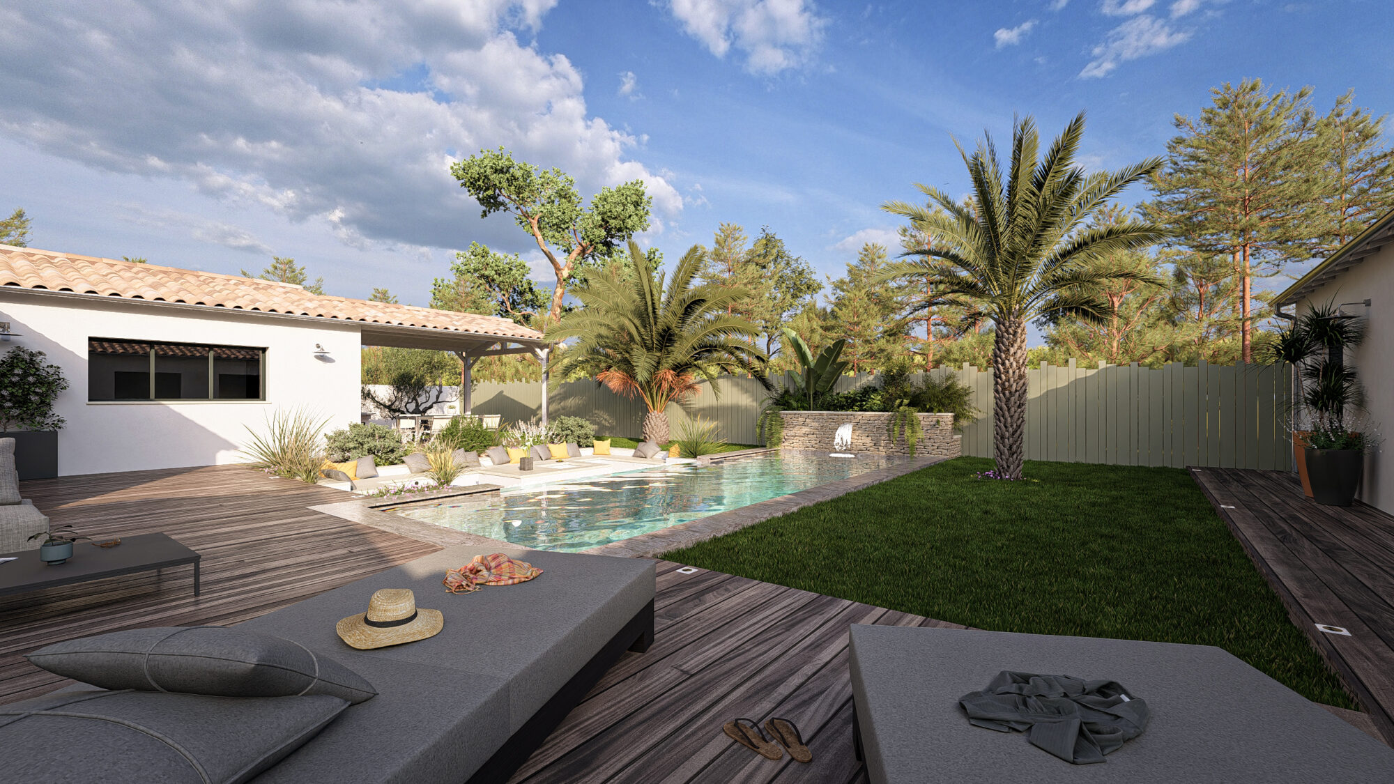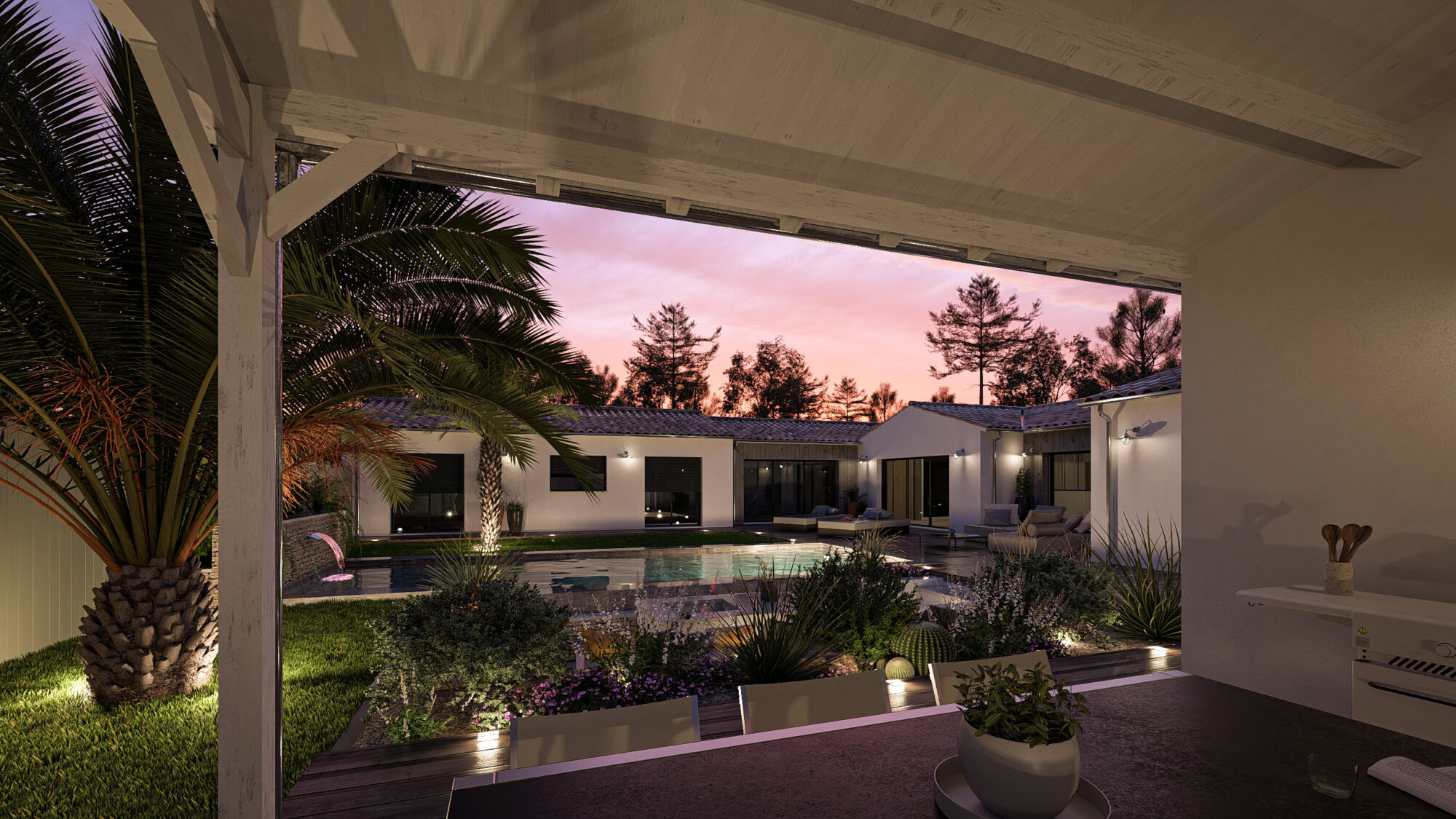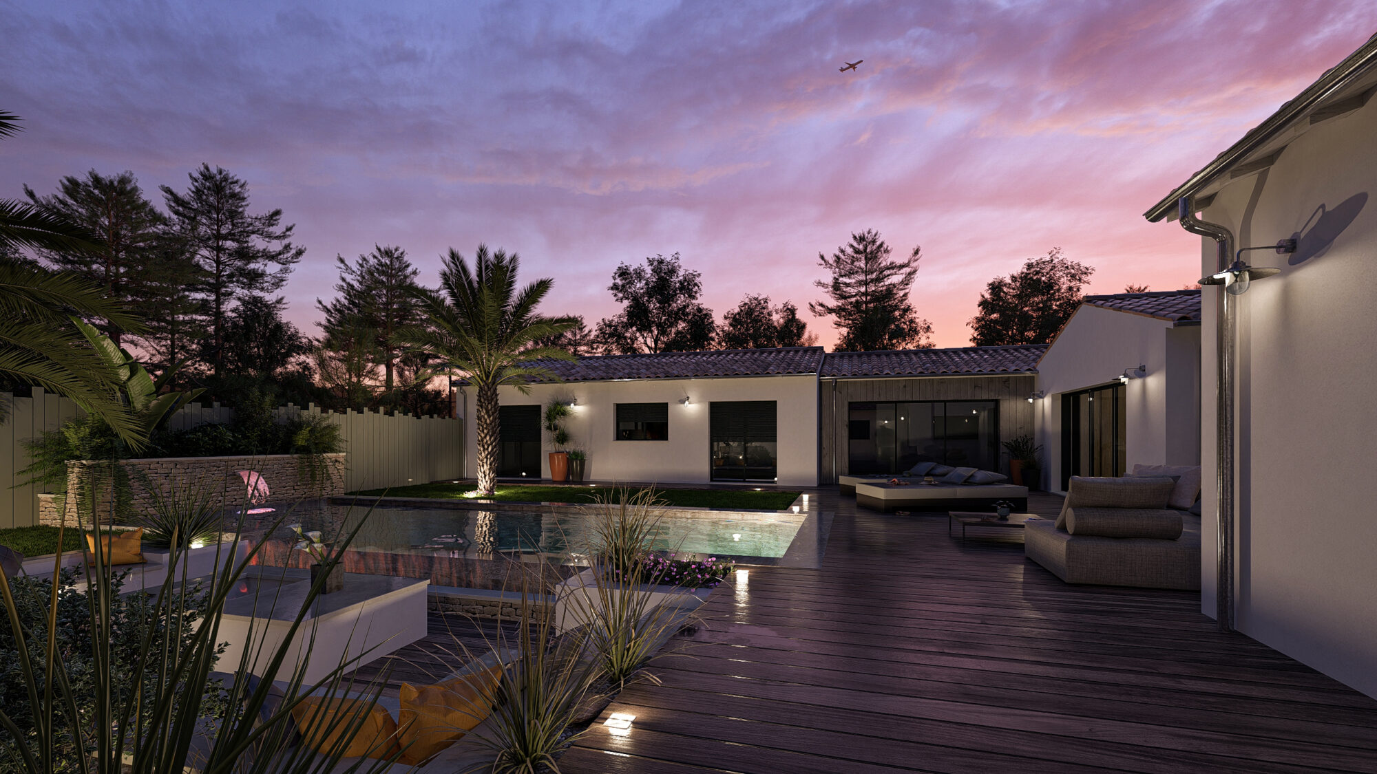 Découvrez cette superbe villa contemporaine de plain-pied, alliant élégance, luminosité et confort moderne. Nichée dans un environnement verdoyant et calme, elle séduit par son architecture épurée et son agencement en U, parfaitement orienté autour d’un espace extérieur central agrémenté d’une piscine à débordement.