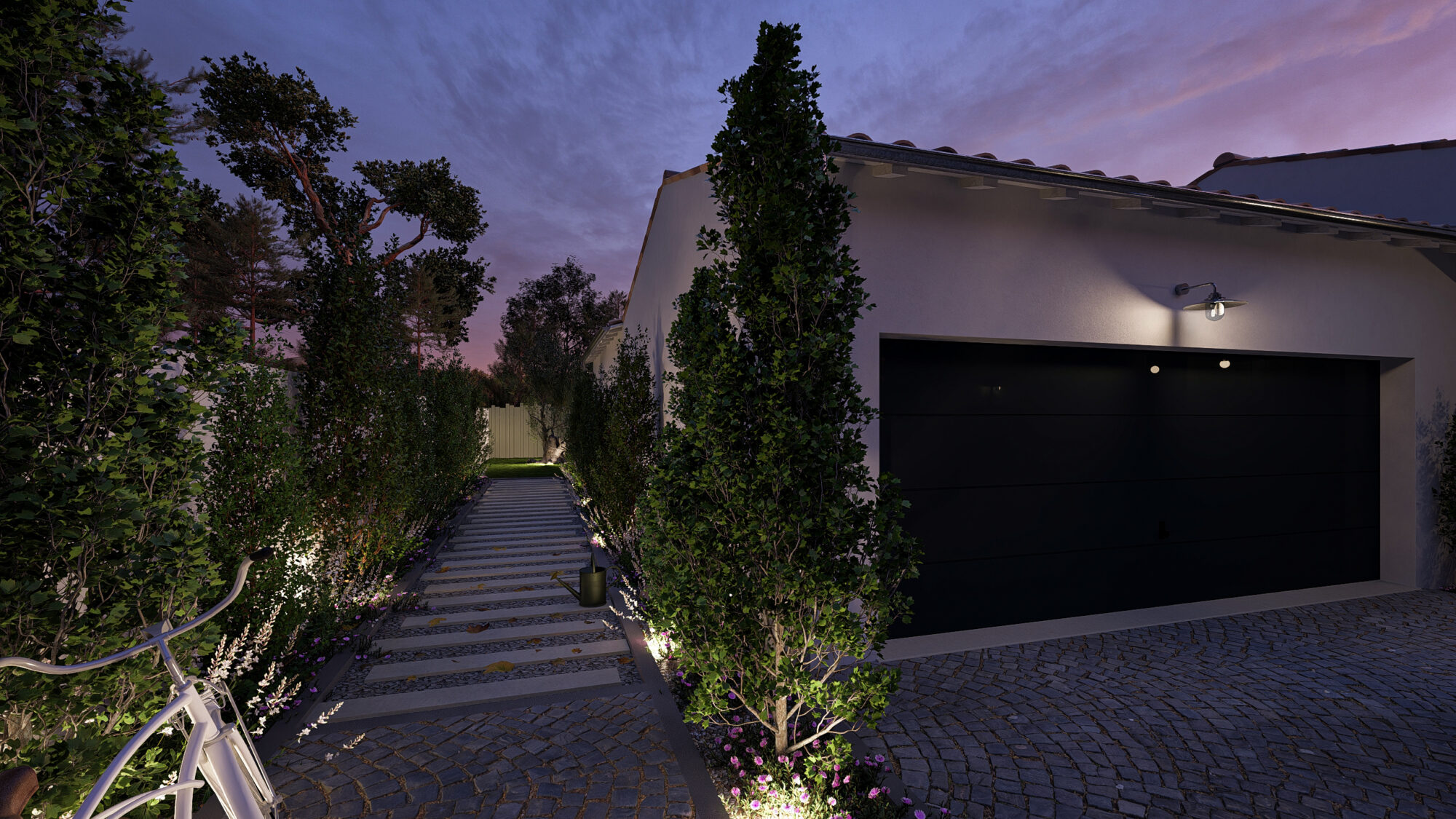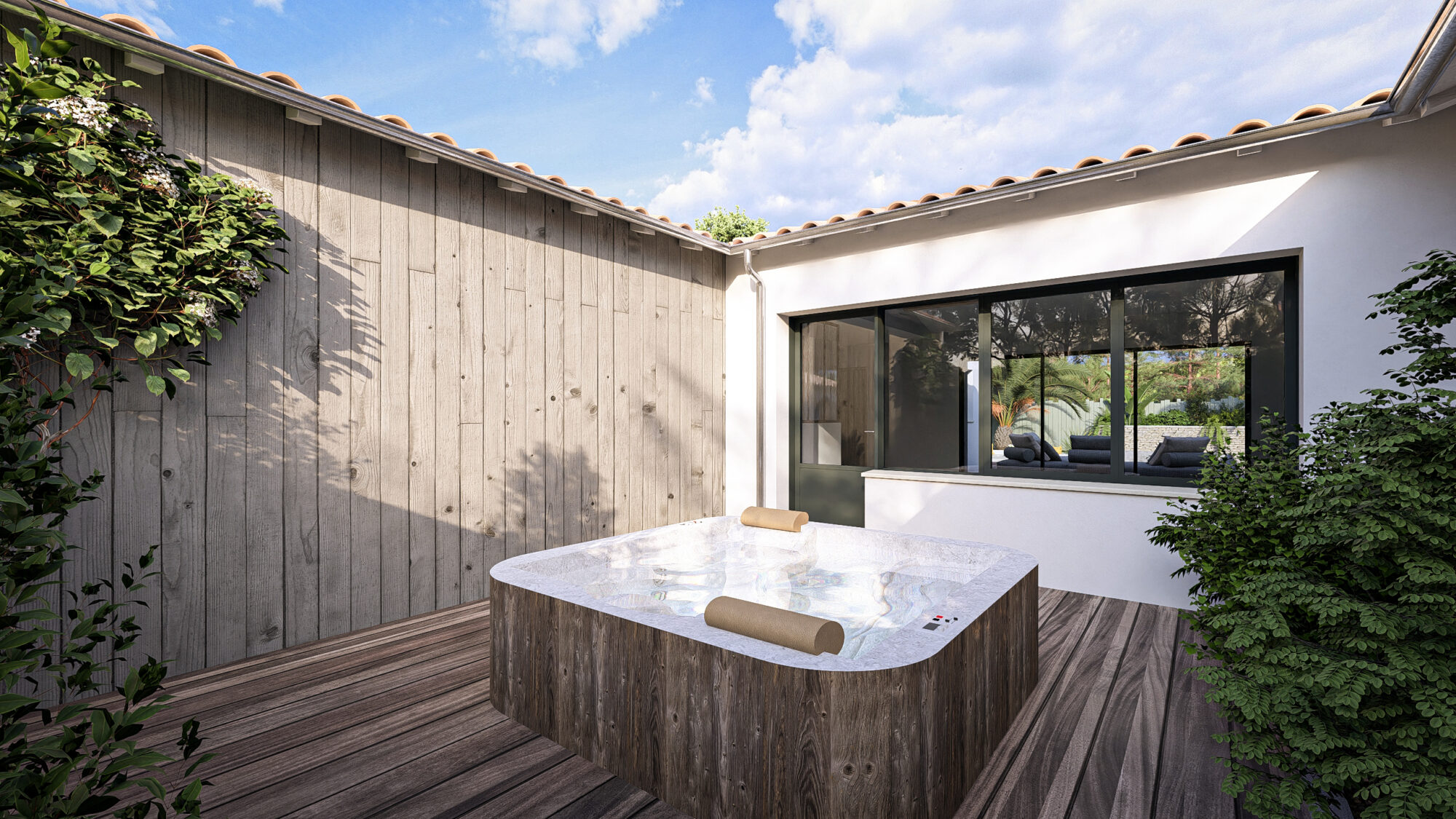 Dès l’entrée, les grandes baies vitrées inondent les pièces de lumière naturelle et offrent une vue dégagée sur le jardin et la piscine.