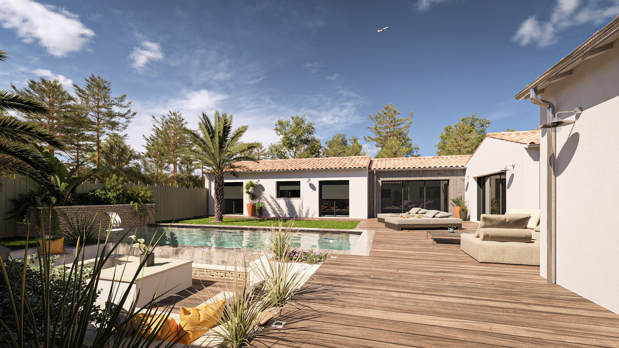 Découvrez cette superbe villa contemporaine de plain-pied, alliant élégance, luminosité et confort moderne. Nichée dans un environnement verdoyant et calme, elle séduit par son architecture épurée et son agencement en U, parfaitement orienté autour d’un espace extérieur central agrémenté d’une piscine à débordement.